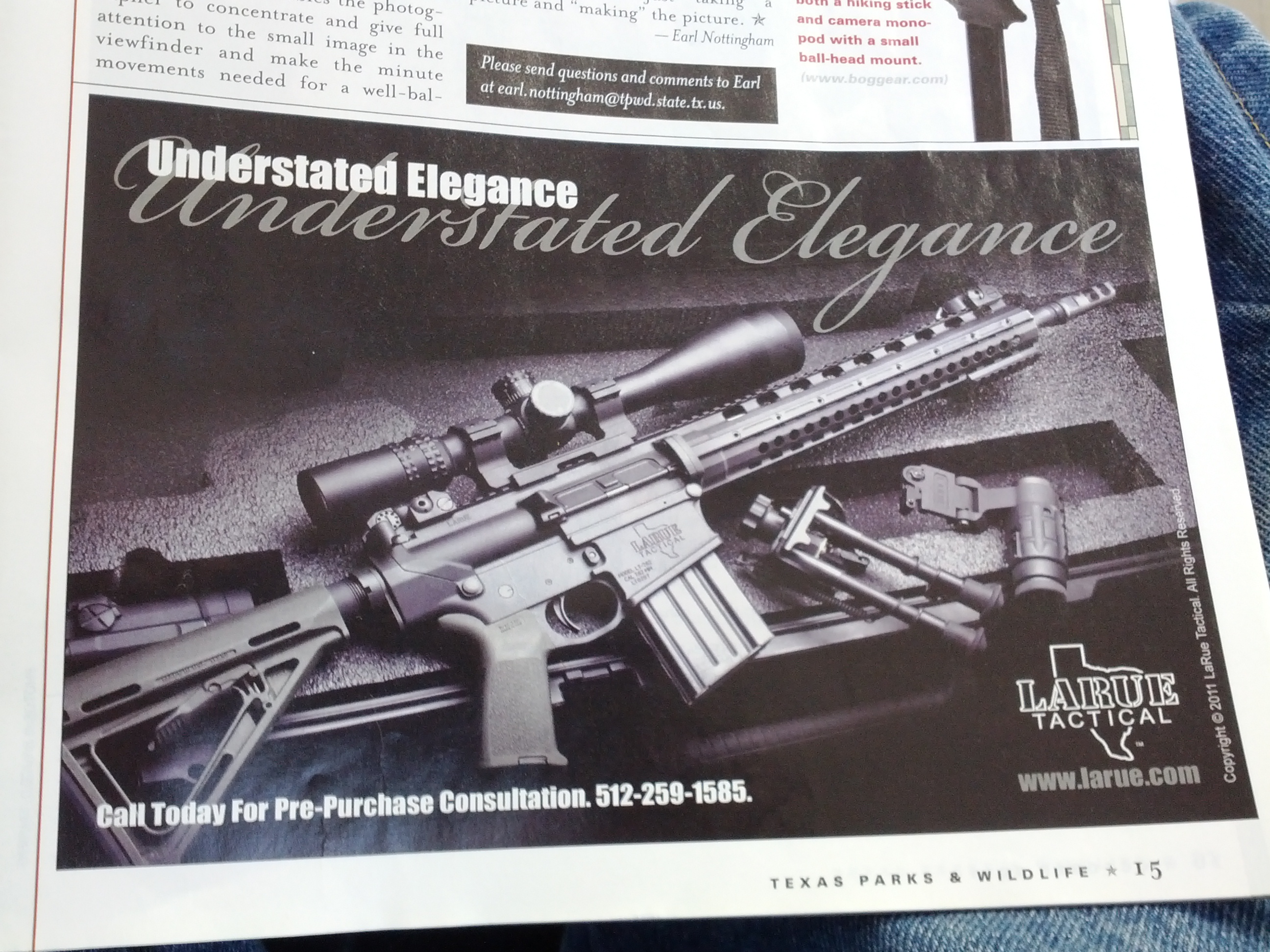 Saw this ad in “Texas Parks and Wildlife” magazine while waiting at the car repair shop (happy Friday the 13th btw)… maybe I’m still a California hippie at heart, but I am really having a hard time finding the part of this which is “understated!”