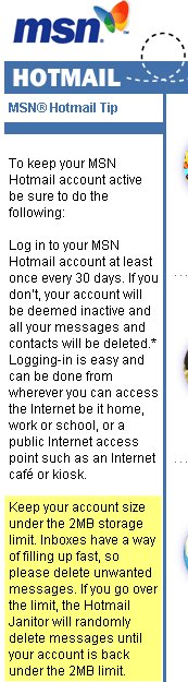 Keep your account size under the 2MB storage limit. Inboxes have a way of filling up fast, so please delete unwanted messages. If you go over the limit, the Hotmail Janitor will randomly delete messages until your account is back under the 2MB limit.